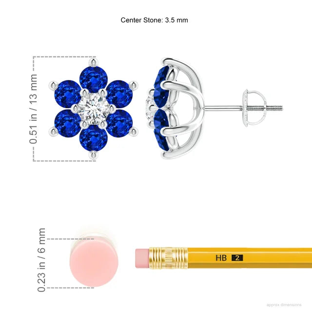 Celebrate color, brilliance, and timeless design with these enchanting flower stud earrings. Each earring blooms with six round lab-grown blue sapphires, arranged in perfect symmetry around a brilliant white lab-grown diamond center. The sapphires radiate deep royal blue, beautifully complemented by the diamond’s luminous sparkle, creating a striking yet feminine contrast.