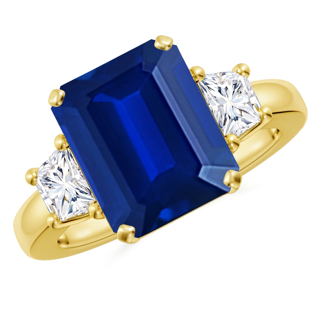 This Lab-Grown Emerald-Cut Blue Sapphire and Diamond Three Stone Ring features a bold emerald-cut lab-grown sapphire center stone flanked by two sparkling trapezoid-cut lab diamonds. Available in 14K or 18K white, yellow, or rose gold, this prong-set design delivers outstanding brilliance and elegant symmetry. The three-stone configuration represents past, present, and future—a meaningful choice for engagements, anniversaries, or milestone celebrations.