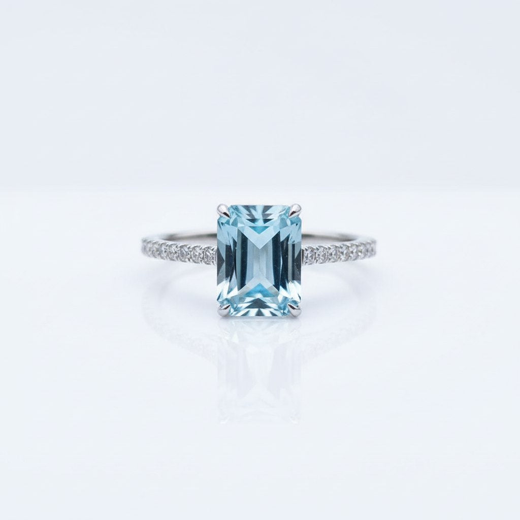 Elevate elegance with this Emerald-Cut Aquamarine Ring with Diamond Band—a stunning statement of tranquility and refined luxury. Expertly crafted in your choice of 14K or 18K white, yellow, or rose gold, this ring features a mesmerizing emerald-cut aquamarine center stone, showcasing the gem's signature icy-blue clarity. Available in 3, 4, or 5 carat sizes, the aquamarine takes center stage, while the slender pavé-set diamond band adds brilliance and sophistication, making this piece perfect for engagements, anniversaries, or those seeking a serene yet breathtaking alternative to traditional diamonds.