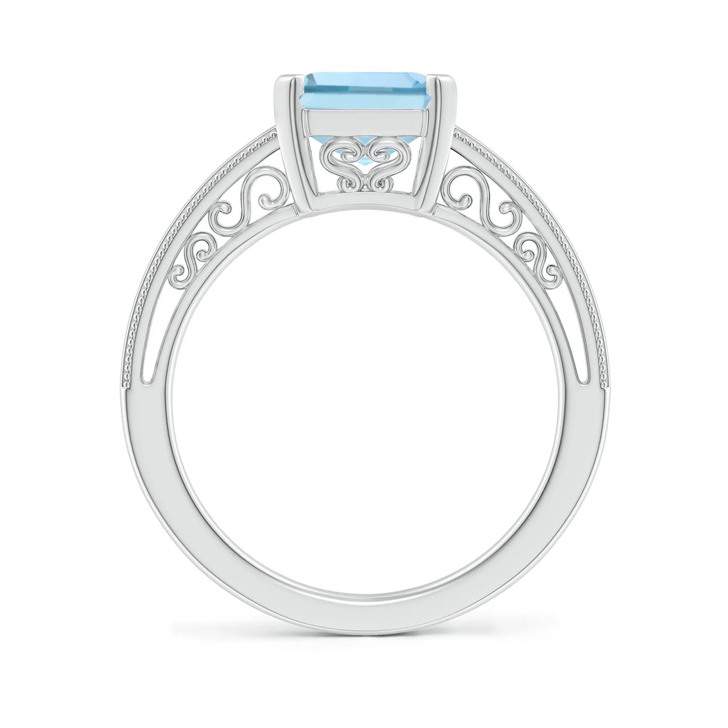 This emerald-cut aquamarine solitaire engagement ring combines classic design with vintage-inspired milgrain detailing. The ring features a natural aquamarine centerstone in a secure prong setting, complemented by delicate beading along the band edges and ornate scrollwork beneath the gallery.