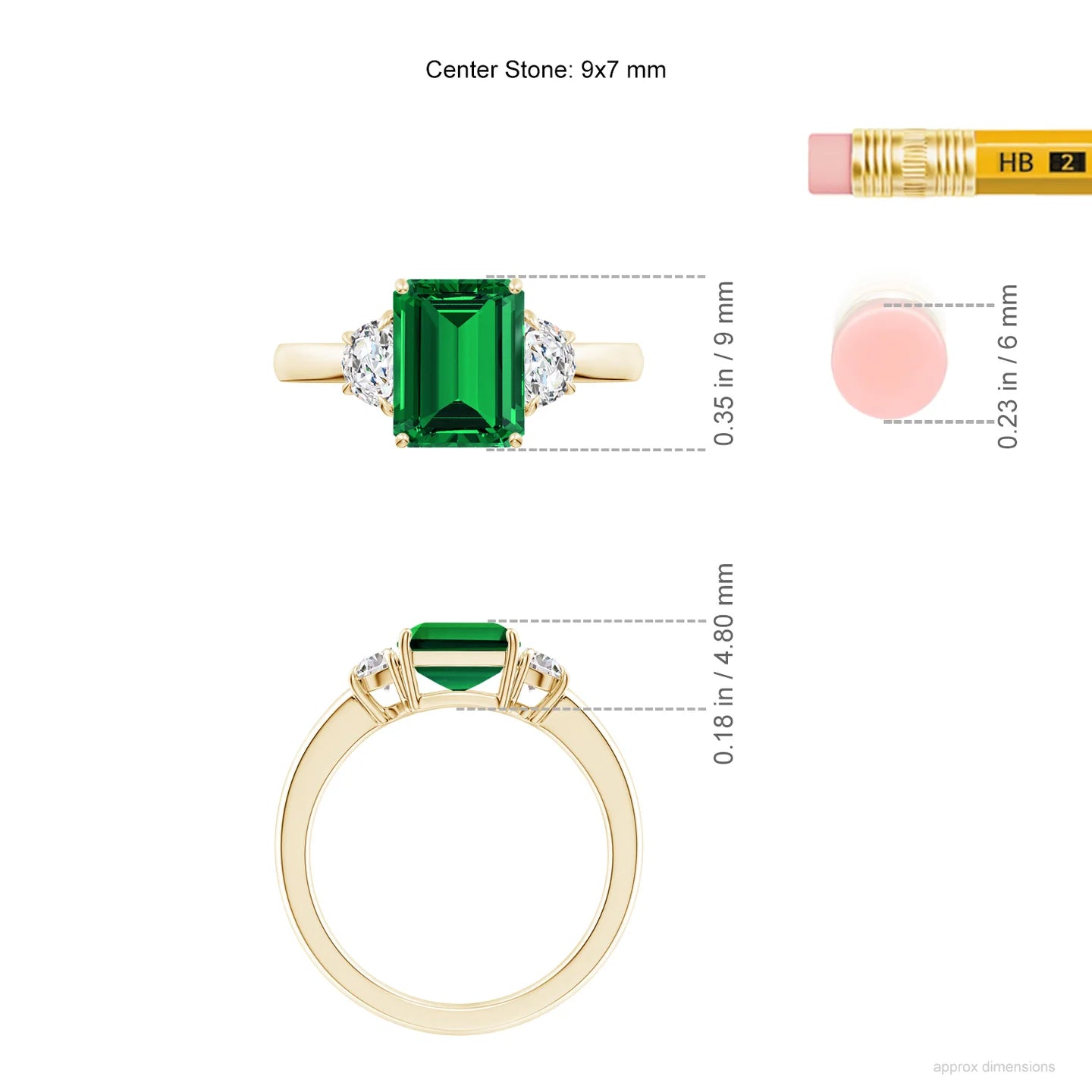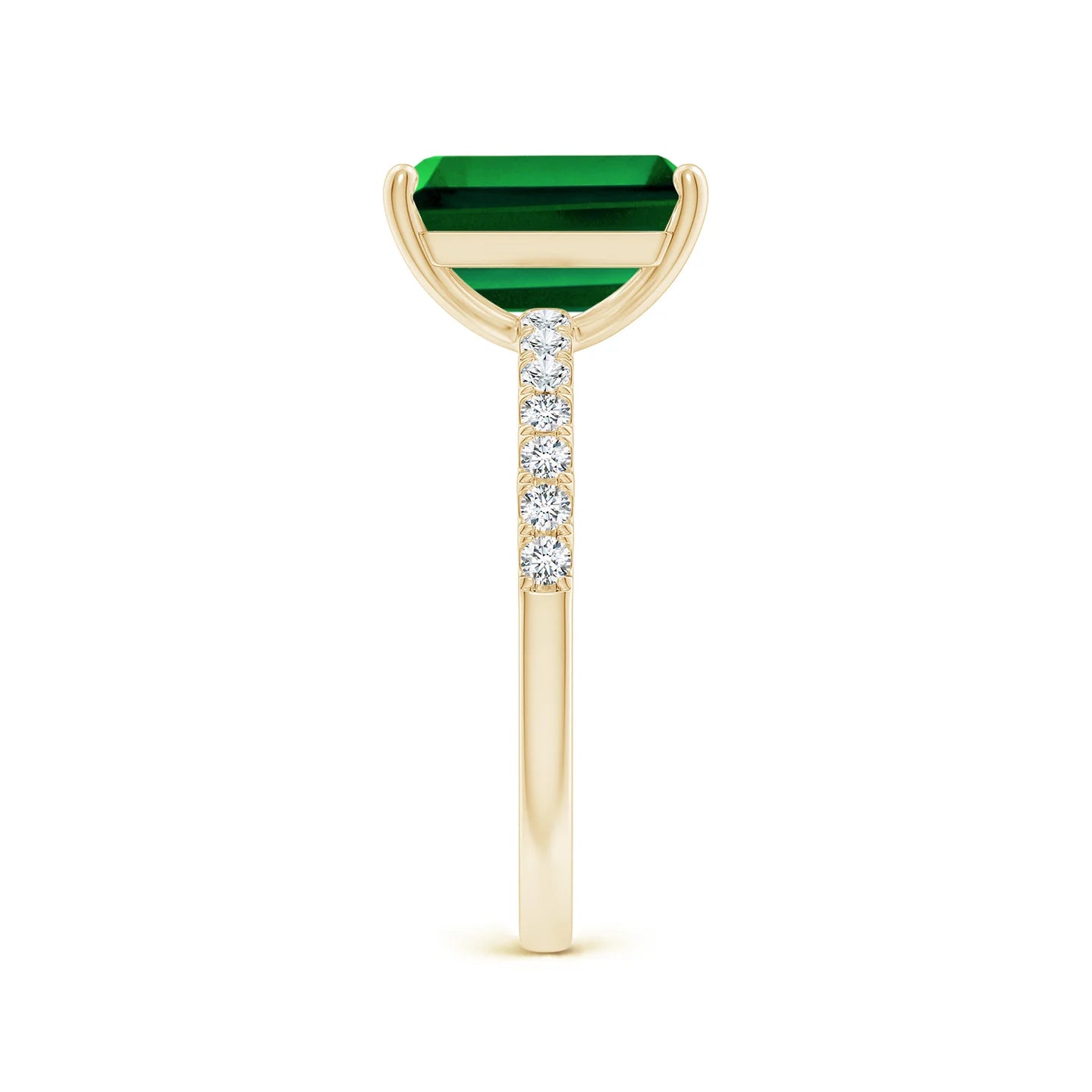 - Center Stone: Lab-grown emerald, emerald cut, 9x7 mm; also available in a range of carat sizes for your ideal statement